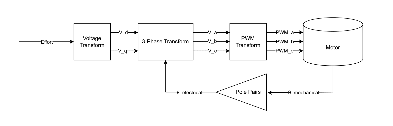 The control system accepts an input called Effort—a percentage of the motor’s maximum speed, ranging from -100% to 100%. This effort value is converted into a voltage in the direct–quadrature (DQ) reference frame, where voltage in the q-axis produces maximum torque, and voltage in the d-axis produces none. As such, the input voltage vector is defined as: